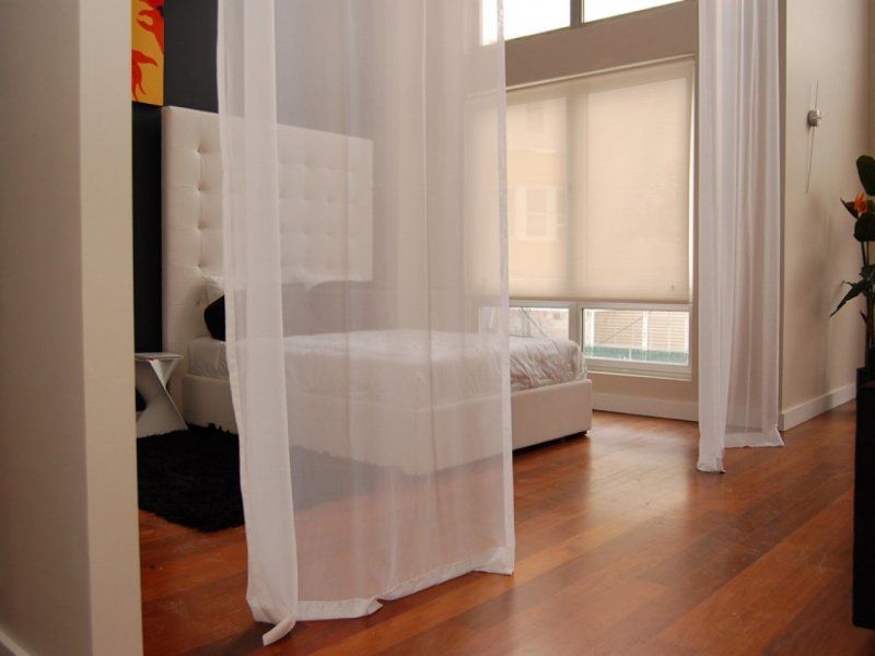 С помощью штор из плотных тканей обычные помещения превращают в дорогие и богемные. Особое внимание уделяют подхватам. Один из самых красивых вариантов — узкие нитяные шторы разноцветного окраса. Их можно декорировать собственноручно, например, с использованием пайеток. Рулонные шторы в большинстве случаев представляют собой сплошное полотно, которое поднимается и опускается, полностью закрывая дверной проем. Однако в последнее время популярность приобрели рулонные жалюзи. И в первом, и во втором случаях конструкции регулируются цепочным механизмом, привычным для обычных жалюзи.