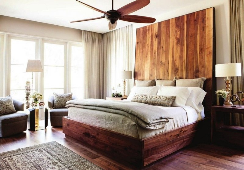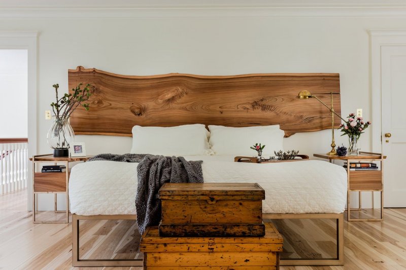 Оформить кровать можно элементами из шпона, досок, паллетов. Для основы часто используют сосну, а отделку производят более дорогими и прочными породами – срезом дуба, ясеня, бука. Деревянное изголовье отлично подойдет к любому тематическому стилю. Чтобы создать стильный, живой интерьер при оформлении спинки, можно использовать одну из следующих оригинальных идей:
