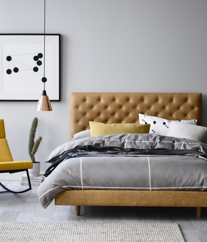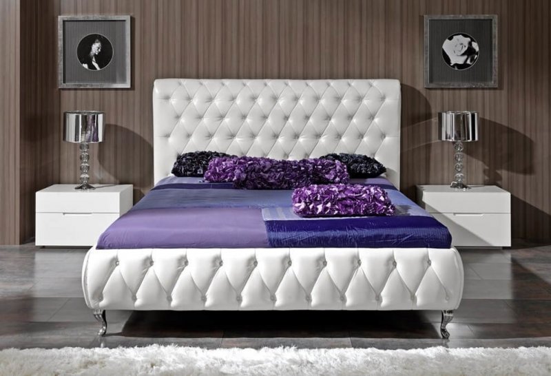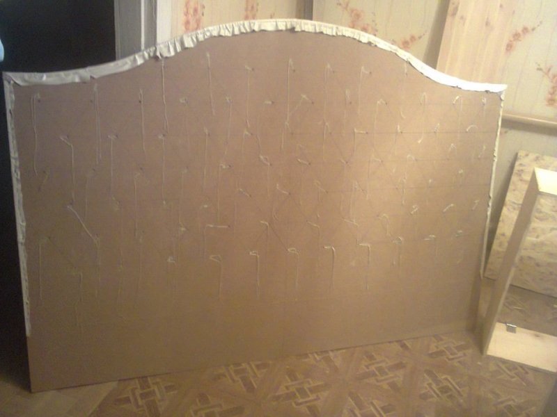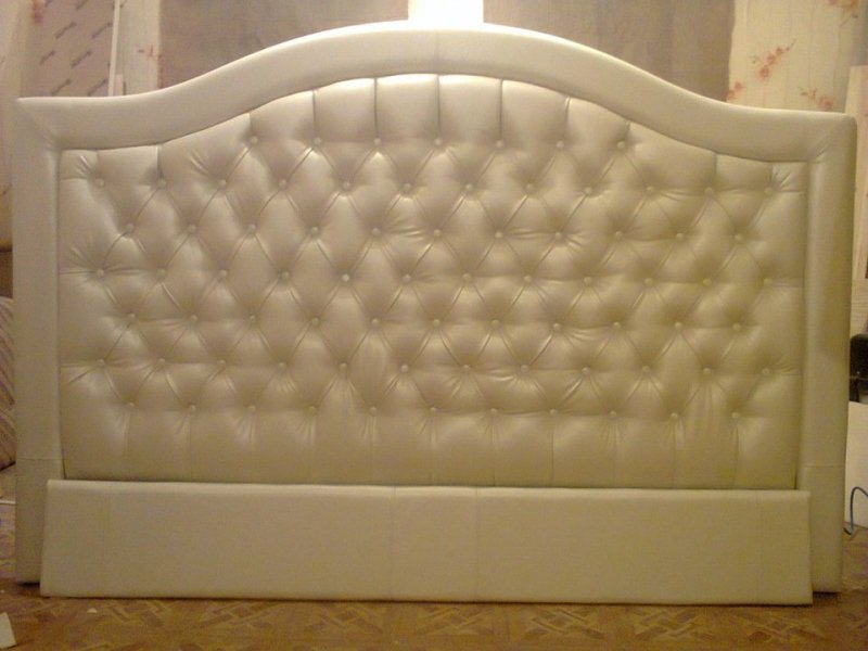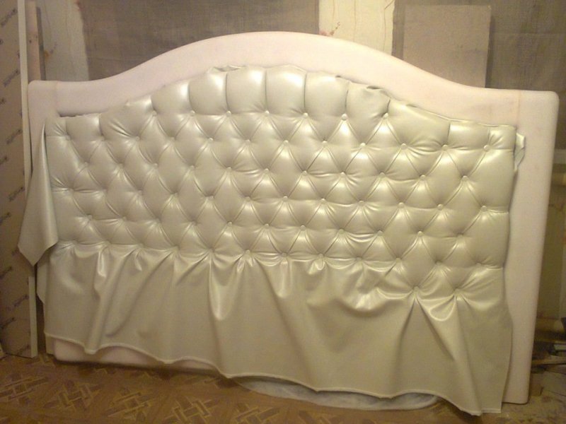 Отличительная черта такой спинки – мягкая плотная обивка, перетянутая пуговицами или любыми другими декоративными элементами. Образующиеся перемычки складываются в рисунок в виде ромбов. Для изготовления такого изголовья потребуется плотная износостойкая ткань (замша, велюр, бархат, кожаный отрез), обтяжные приспособления, фанера, поролон, высокопрочные нитки.