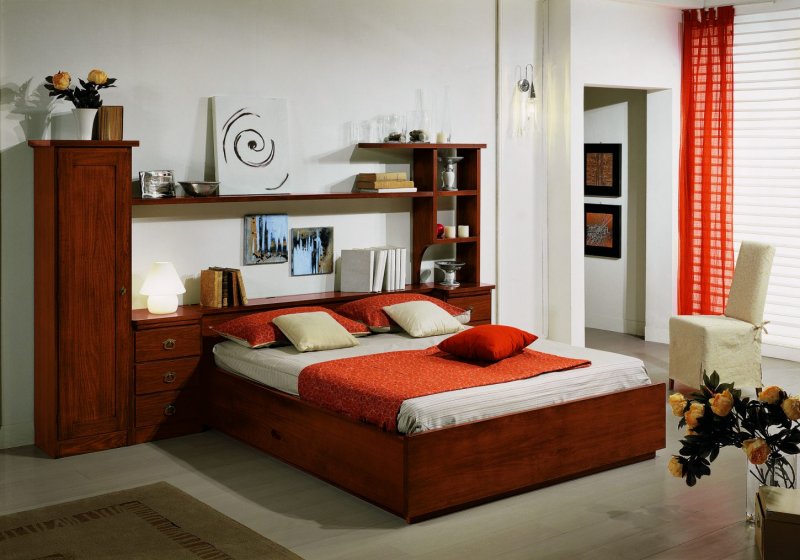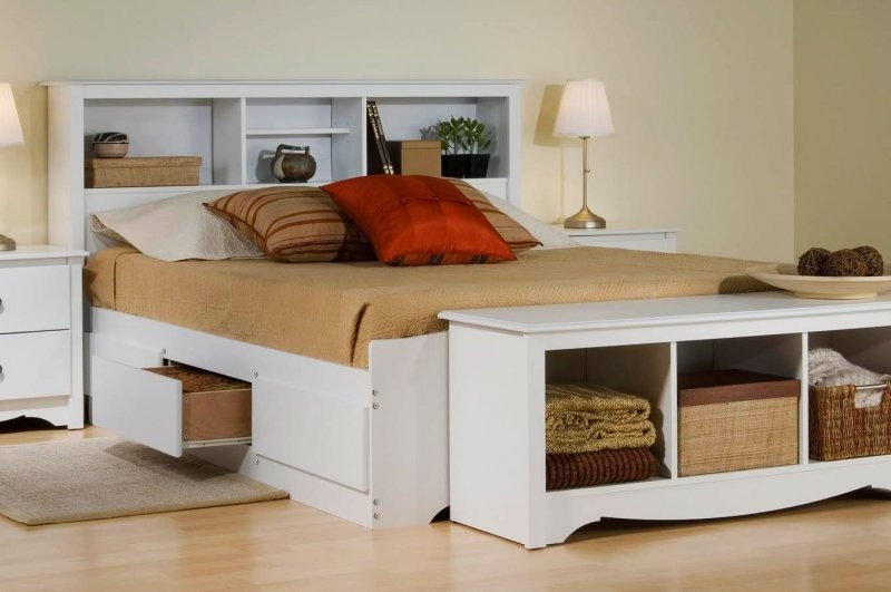 Кровати с полками у изголовья – настоящая находка для небольших помещений. Это создает дополнительную возможность для хранения книг, постельных принадлежностей, размещения декора. Такая конструкция спинок позволит сэкономить средства и площадь для размещения прикроватных тумб. Ее можно использовать в точности с их назначением, разместить светильник, положить любимую книгу.