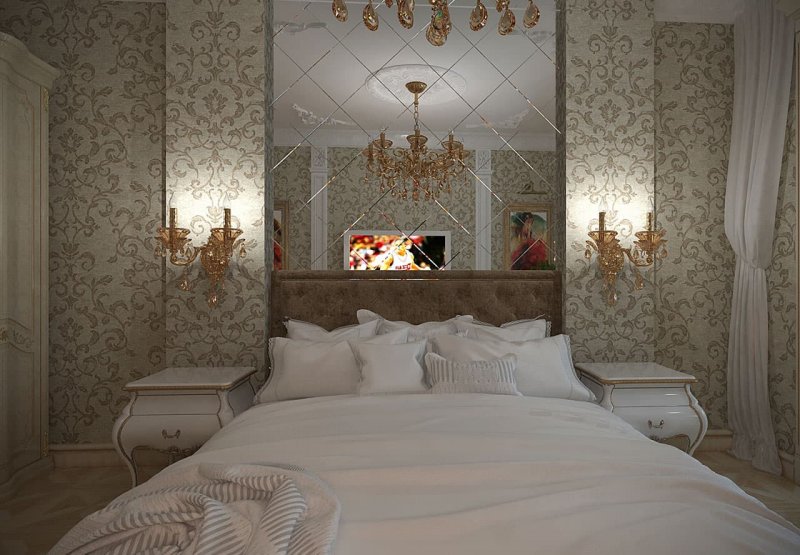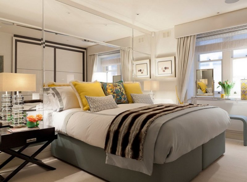 С помощью зеркального изголовья кровати можно скорректировать пропорции спальни, добавить света, сделать помещение нарядным и праздничным. При ночном освещении такое оформление наполняет комнату романтичным отражением приглушенных светильников. Можно использовать различные дизайнерские приемы – одиночное зеркало в центре стены, отражающий коллаж у изголовья, зеркальную стену с переходом на потолок, зеркало как элемент мебельной конструкции.