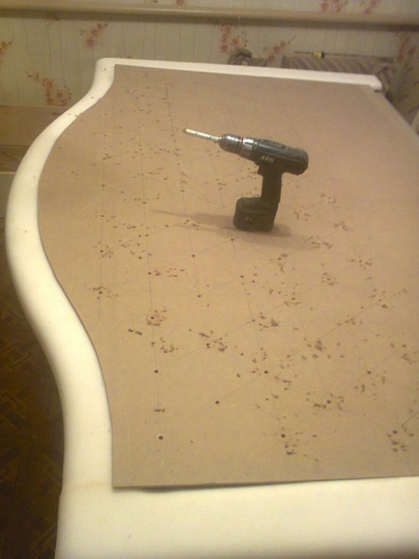 Работу начинаем с разметки. На поролоне рисуем симметричные ромбы подходящего размера. Проделываем сквозные отверстия в точках пересечения стежка. Затем таким же образом размечаем фанеру, просверливаем дырочки. Они должны точно совпадать. Чтоб две заготовки не смещались, их необходимо склеить.