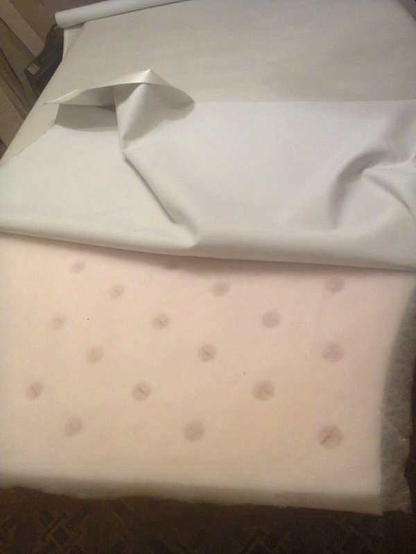 Ткань, чтобы обтягивать конструкции, необходимо подбирать с большим запасом. Следует учесть залегание материала в складку, толщину поролона, участок для свободного крепления. Обтяжку надо начинать с крайней точки спинки. В каждое отверстие помещаем одновременно две большие иглы с прочной нитью, выводим наизнанку и прикрепляем степлером к фанере в виде зигзага. В процессе работы формируются складки и красивый рисунок. Оставшуюся ткань со всех сторон изголовья следует подвернуть и закрепить с изнаночной стороны.