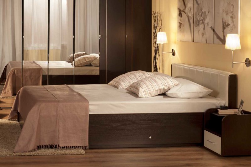 Перед тем как начинать обустройство зоны над кроватью сложными отражающими поверхностями, например, зеркальной плиткой, необходимо убедиться, что конструкция не вызовет ненужного смущения. В тестовом режиме можно декорировать спинку кровати небольшим прямым зеркалом.