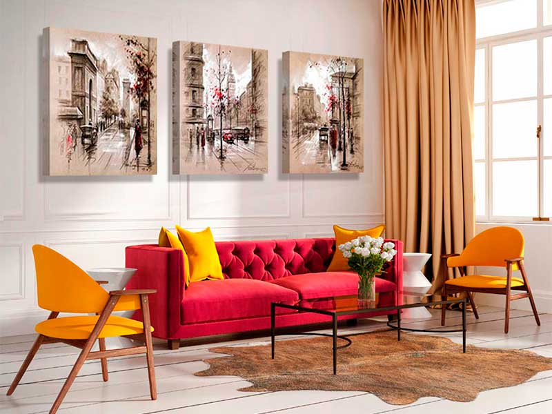 Сюжеты с перспективой, абстрактными элементами или мелкими объектами (к примеру, букетик полевых цветов), должны располагаться строго на линии уровня глаз. Если их повесить чуть выше, то декор может «потеряться» в интерьере. Когда планируется горизонтальное размещение нескольких картин разных размеров, их высота высчитывается индивидуально. Кстати, подобный ход поможет визуально сделать комнату шире. Горизонтальный центр каждого изображения должен совпадать с условной линией «уровня глаз». Неправильно ориентироваться на расположения рамок в один ряд по низу или по верху. Группа вертикальных картин визуально делает потолок выше. Оптимальным количеством изображений считается трио. Центральная картина располагается на уровне глаз. Ее сюжет может быть нейтральным. Две другие картины вешают ниже и выше уровня глаз соответственно. Чтобы изображения не потерялись, следует выбирать красочные, яркие сюжеты.