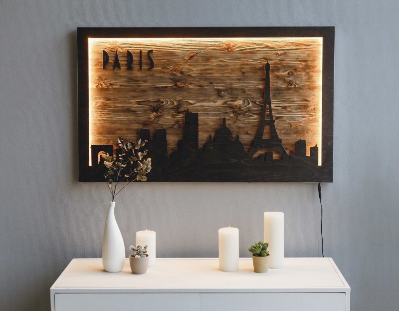 Доски в основном используются для подвешивания группы картин. Система крепления размещается на небольшом расстоянии от стены, закрепляясь на кронштейнах. В качестве основы можно брать массив дерева, ДСП или МДФ. Поверхность материала покрывают лаком или окрашивают в подходящий к интерьеру цвет. Шероховатые края МДФ или ДСП покрывают специальной шпоновой лентой для срезов. Картины закрепляют на доске с помощью гвоздей или специальных саморезов для древесины. Вариант подходит для большой группы картин, которые впоследствии оставили бы целую россыпь отверстий на стене. Дополняют необычную систему крепления декоративной подсветкой. Лампочки размещают между доской и стеной. Мягкий, рассеянный свет сделает этот элемент интерьера изюминкой дизайна помещения.