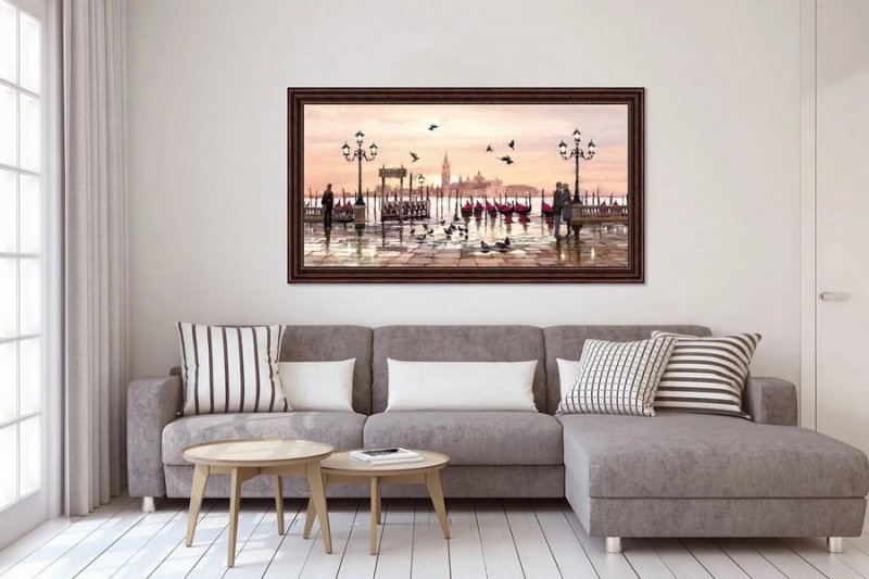 Цветовая гамма картины — еще одна важная характеристика, на которую нужно обращать внимание при выборе полотна для конкретной комнаты. Для спальни сюжеты, выполненные в голубых, желтых, сиреневых, розовых, персиковых тонах. К гостиной и прихожей подойдут более контрастные сочетания цветов: красный, синий, фиолетовый, травяной зеленый. Для кухни лучше выбирать теплые оттенки желтого и коричневого, стимулирующие аппетит.