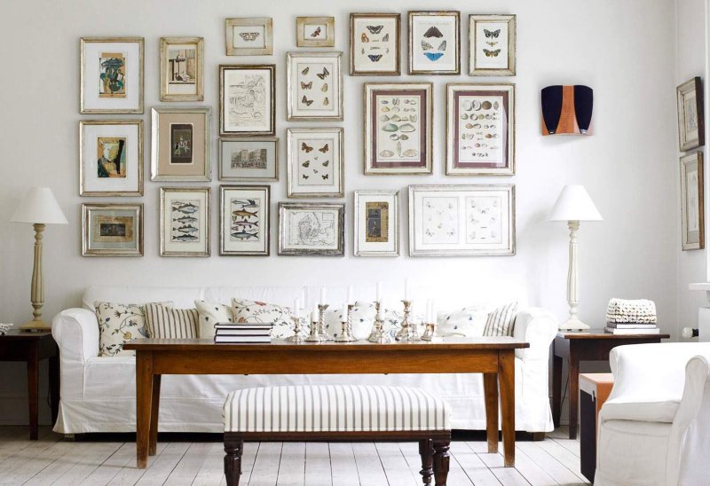 Перед тем как вешать группу картин на стену, их следует разложить на полу. Рассчитать расстояния от частей композиции, примериться, насколько они сочетаются.