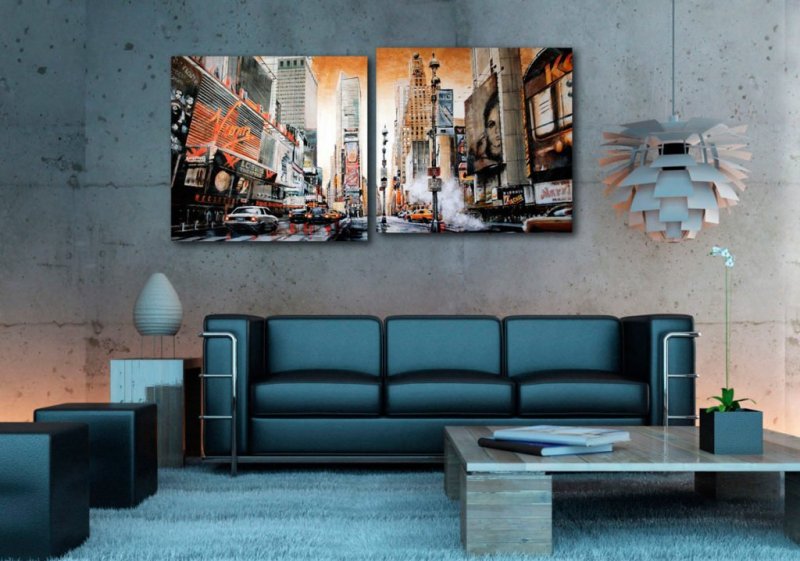 В одну группу объединяют картины, схожие по цветовой гамме и стилистике. Можно пойти от противного и соединить контрастные полотна. Такой комбинированный декор точно привлечет к себе внимание. Если нужно объединить в группу одно большое изображение и несколько маленьких полотен, то правильно будет расположить крупный объект в центре и окружить его небольшим декором. Когда картины имеют одинаковые размеры, их вешают в один ряд на равном удалении друг от друга. Встречаются и неординарные варианты: размещение изображений вдоль диагональной линии. Получается своеобразная «лесенка» из полотен. Подобный способ расположения весьма популярен для модульных картин. «Разрезанное» изображение подчеркивает креативность интерьера. Причем расположение по диагонали смотрится лучше всего с модульными картинами, секции которых имеют разные размеры. К примеру, в центре два прямоугольных полотна, расположенных вертикально, дополняются двумя квадратными изображениями.