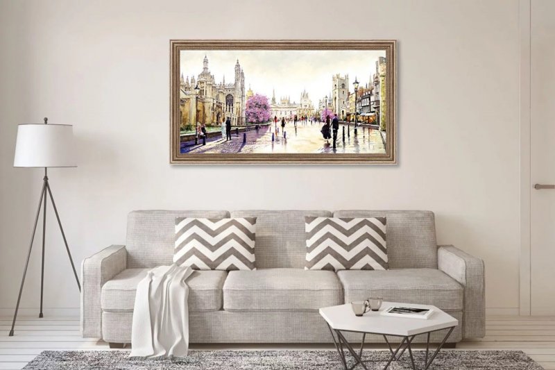 Первый вопрос, который нужно решить сразу после покупки: на какой высоте вешать картину, чтобы ее можно было рассмотреть во всех подробностях? Здесь рекомендуют отталкиваться от цветовой композиции и особенностей сюжета изображения. Картины с крупными объектами, выполненными в сочных, ярких красках, вешают либо на уровне глаз, либо чуть выше этой условной линии. Как правильно определить ее расположение? От стены нужно отойти на несколько шагов и отметить линию на стене, куда падает взгляд с этого расстояния у человека среднего роста. Затем нужно определить условную середину картины. К примеру, в пейзажах это будет полоска горизонта. Вот она-то и должна лежать в районе падения беглого взгляда.