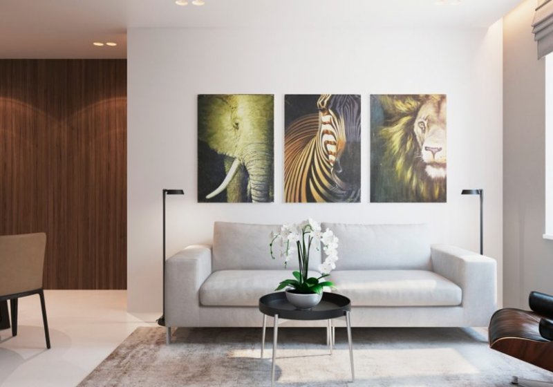 Как уже говорилось выше, горизонтальные картины визуально расширяют границы стен. Они хорошо работают в паре с широкими предметами меблировки: спинкой дивана или кровати, комодом, столом, тумбочкой. Вертикальные картины, наоборот, делают стены выше, вытягивают пространство вдоль условной линии от пола до потолка. Их необязательно привязывать к элементам меблировки. Обычно группами таких декоративных объектов украшают выступы или короткие стены коридоров, комнат неправильной формы, боковушки по обе стороны широких дверных проемов. Необычно смотрятся модульные картины, состоящие из нескольких вертикальных частей, образующих единую композицию (диптихи, триптихи, полиптихи). Их следует рассматривать только в совокупности, то есть как одно большое горизонтальное полотно, разделенное на секции.