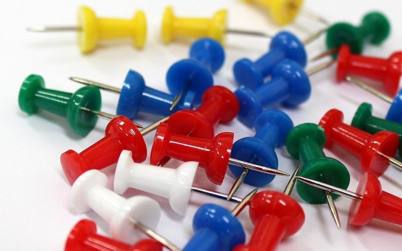 Канцелярские кнопки подходят для небольших картин с малым весом. Их удобно использовать для закрепления группы полотен. Кнопку прикладывают к стене и слегка простукивают ее молотком, регулируя глубину отверстия. Можно забить крепление под наклоном. Не рекомендуют использовать кнопки с цветными пластиковыми шляпками. От удара молотка они обычно раскалываются надвое. Лучше всего взять обычные металлические кнопки с круглыми шляпками.