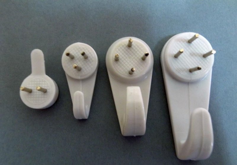 Крючками-паучками называют особый вид креплений, которые можно купить в любом строительном магазине. Они представляют собой маленькую деталь с четырьмя «ножками». Крючок прикладывают к поверхности и вбивают молотком заостренные концы в стену. Они настолько тонкие, что отверстия практически не оставляют следов. На «крючок» подвешивают петельку картины. Приспособление может выдерживать нагрузки до 2 кг.