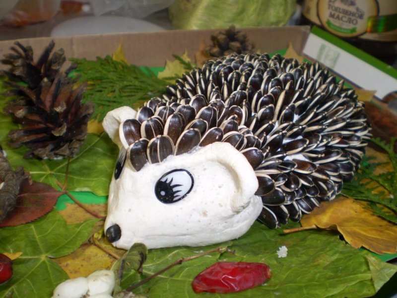 Из пластилина изготавливается туловище и ножки ежика. На спинку приклеиваются семена подсолнуха острыми краешками вверх. Фигурка дополняется глазками и носиком из пластилина.