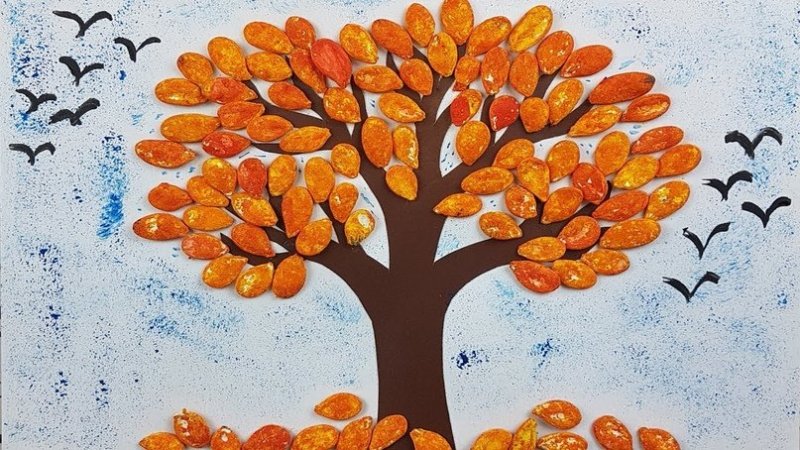 Тыквенные семечки идеально подходят для окрашивания, поэтому из них можно сделать яркие и нестандартные поделки. К примеру, вместе с ребенком, используя этот природный материал, можно изготовить: