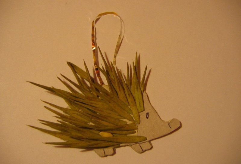 На спинку из иголок-семечек приклеиваются силиконовым клеем (или клеевым пистолетом) пластиковые яблоки и грибочки.