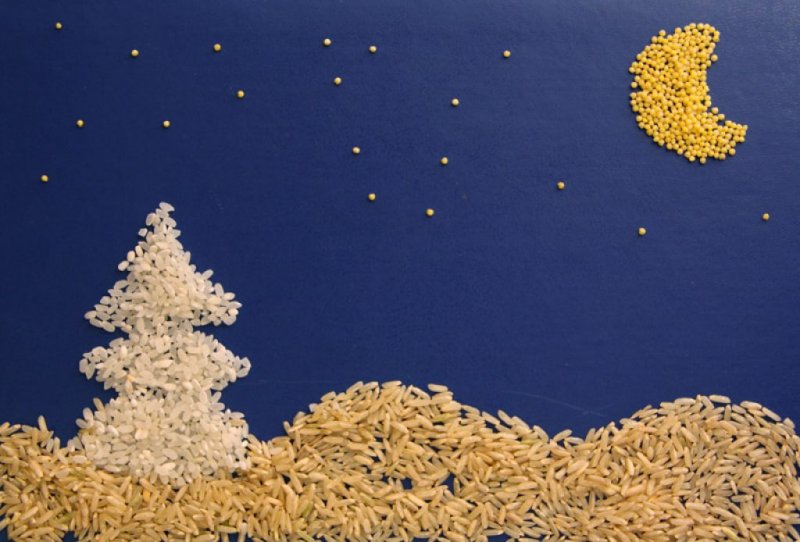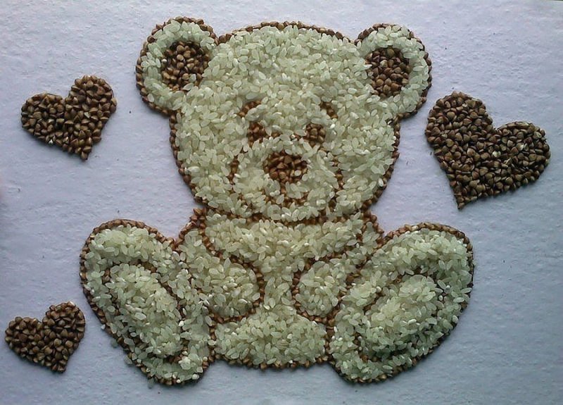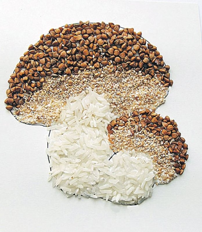 Из обычной гречки, пшена, риса можно создавать яркие прикольные аппликации и полноценные картины. При использовании разные виды материалов могут наклеиваться рядышком или даже слегка накладываться (наклеиваться) друг на друга для формирования объемных картин.