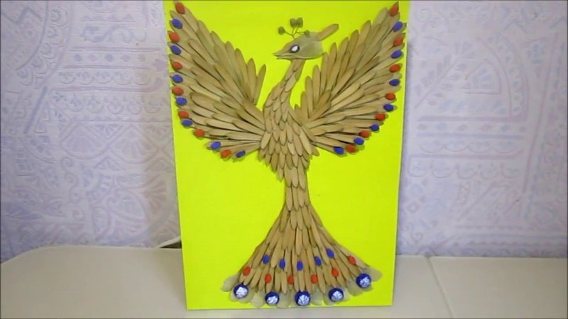 На белом листе картона рисуется павлин. Полоски, разделяющие его хвост на перья, выкладываются арбузными семенами. На кончиках можно наклеить чешуйки шишек или фасоль. Оставшиеся «пустыми» элементы картины просто окрашиваются.