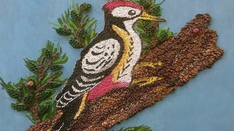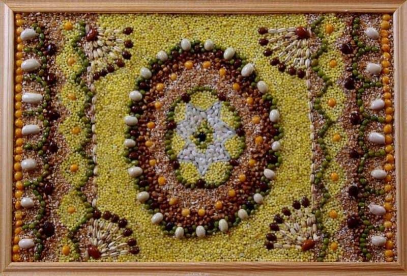 Более сложная поделка, которая изготавливается на фанере. На фанеру приклеиваются тонкие рейки для формирования многочисленных ячеек. Сами ячейки оклеиваются разными зернами и крупами.