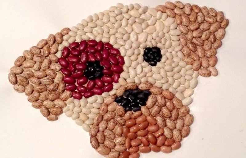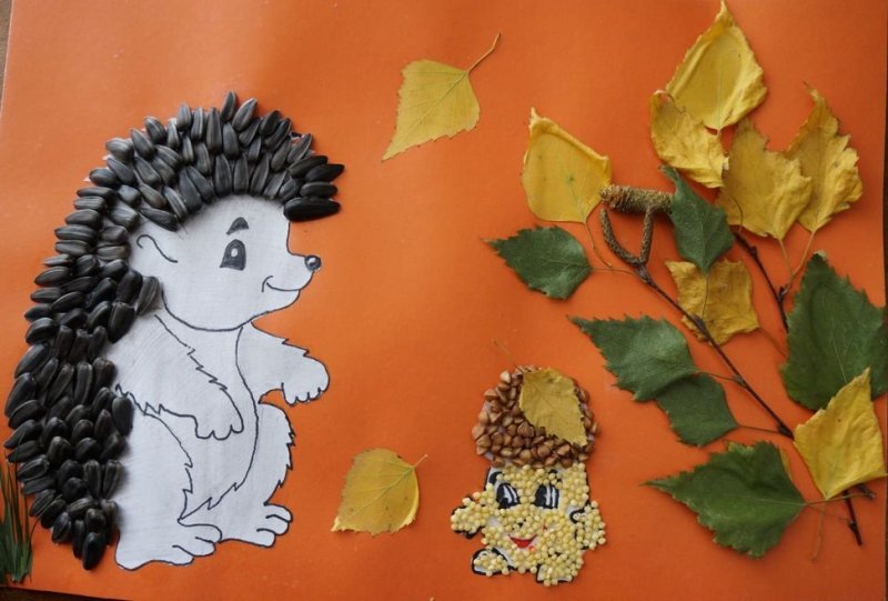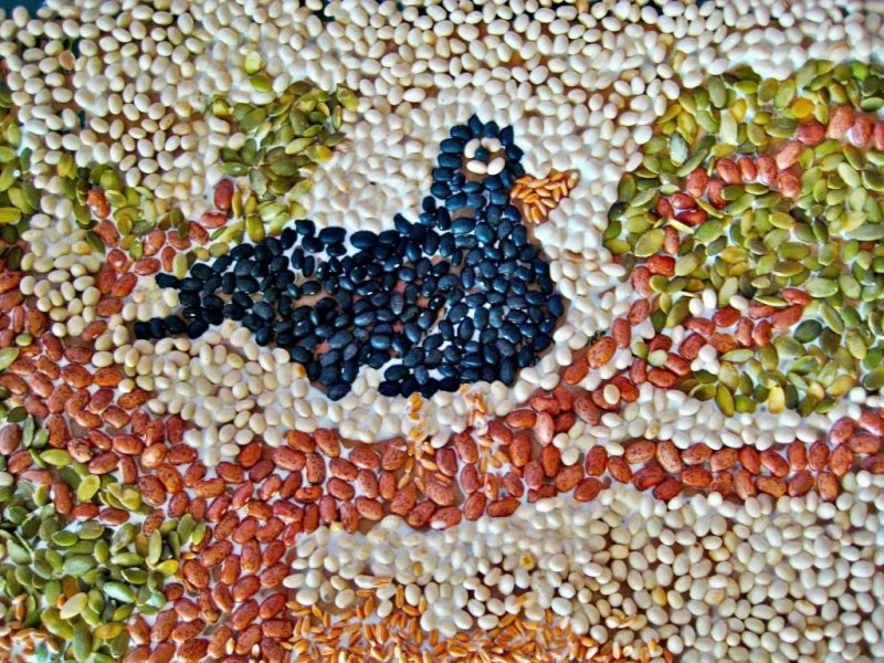 На листе картона нужно нарисовать изображение (к примеру, солнце, сову, кошку). Фон выложить из мелких зерен или крупы, само изображение оклеить более крупными семенами разных оттенков: солнце можно сделать из семян подсолнечника, крылья совы украсить фасолью.
