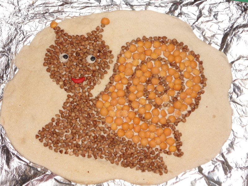 Вокруг одной горошины в 2 ряда наклеить пшено, возле других – чечевицу и рис.