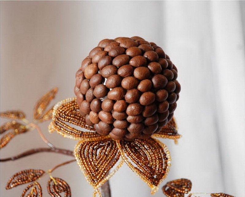 Очень простая поделка, в качестве основы которой используется большой пенопластовый шар. Такой шарик можно оклеивать семенами арбуза, кофейными зернами. По желанию ему можно сделать подставку из шпажки или ветки. Сама конструкция устанавливается внутрь небольшого цветочного горшка.