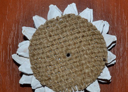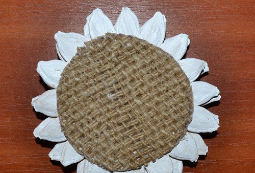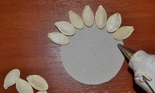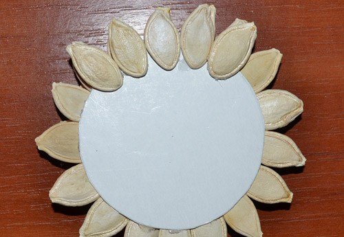 Вокруг готовых сердцевин выкладываются в 1-2 ряда лепестки из семечек тыквы, подсолнечника, арбуза.