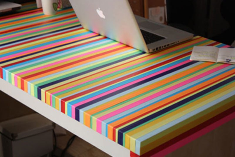 Декоративный скотч разных цветов может наклеиваться на столешницу полосками, формировать квадраты. Сверху дополнительно можно проклеить прозрачную пленку (по примеру, указанному выше) для надежной защиты скотча от повреждений и отслаивания.