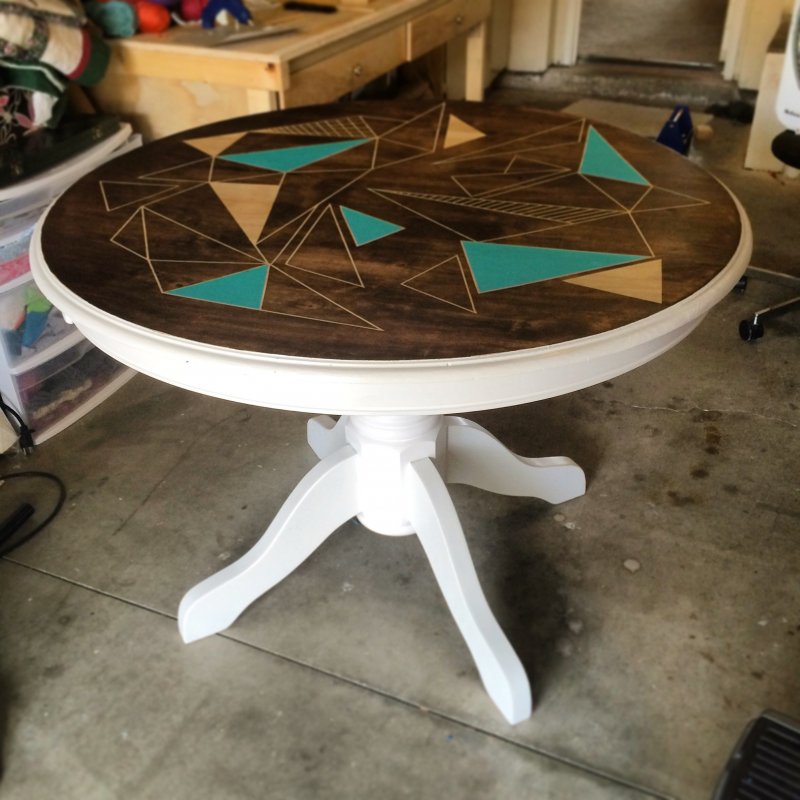 Из картона изготавливается (или покупается уже готовый) трафарет. Трафарет прикладывается к столу, и через вырезанный шаблон столешница окрашивается. Популярный вариант для выделения периметра, углов или центральной части стола.