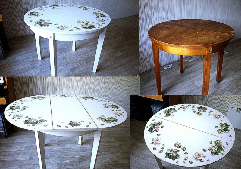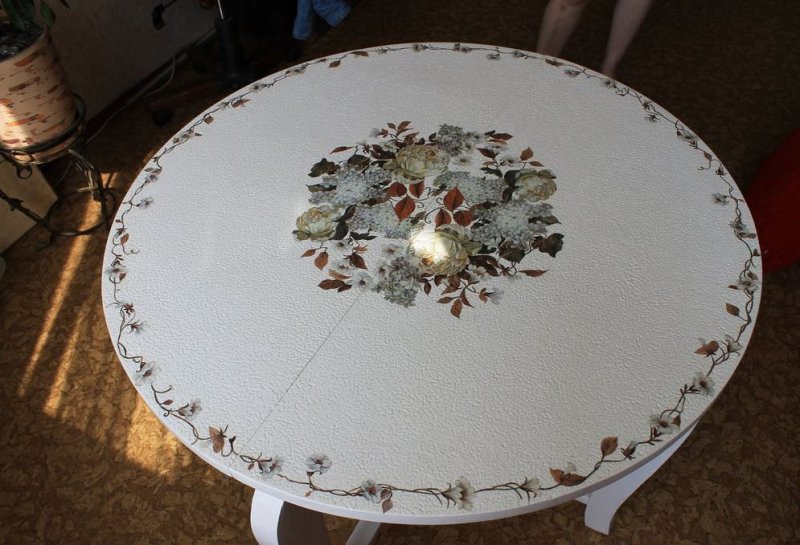 Лучшее решение для столов с фигурными выступами или углублениями. Изначально с помощью мелкоабразивной наждачки зачищается вся столешница, каркас. Затем обезжиривается. На декупажный клей наклеиваются выбранные для декорирования салфетки (или бумага, тонкая газета). После высыхания клея изделие покрывается прозрачным лаком.