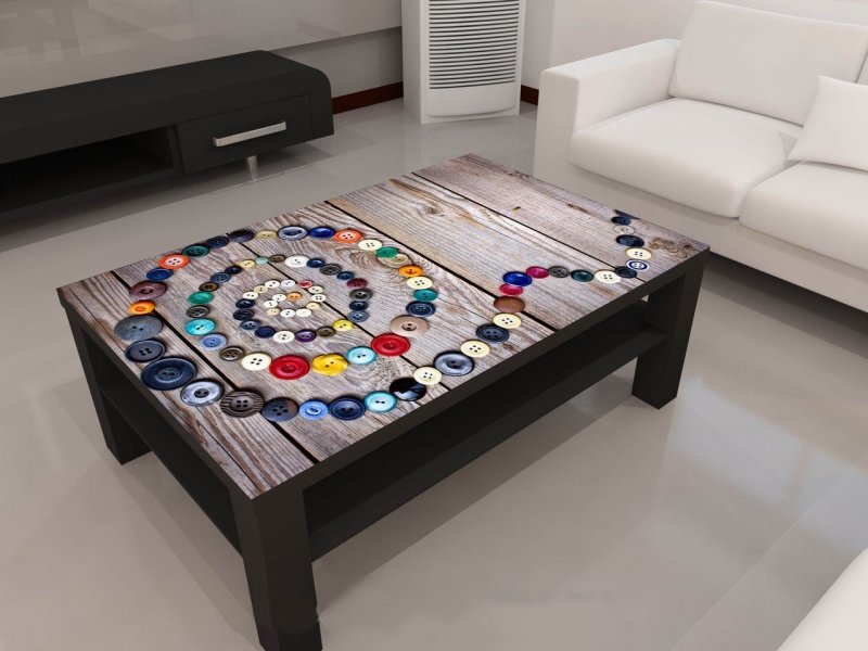 Под размер прямоугольного столика можно заказать стикер с изображением кассеты (для круглого можно с виниловой пластинкой, для овального – разрезанную грушу или дыню). Наклеить на очищенную поверхность изображение.