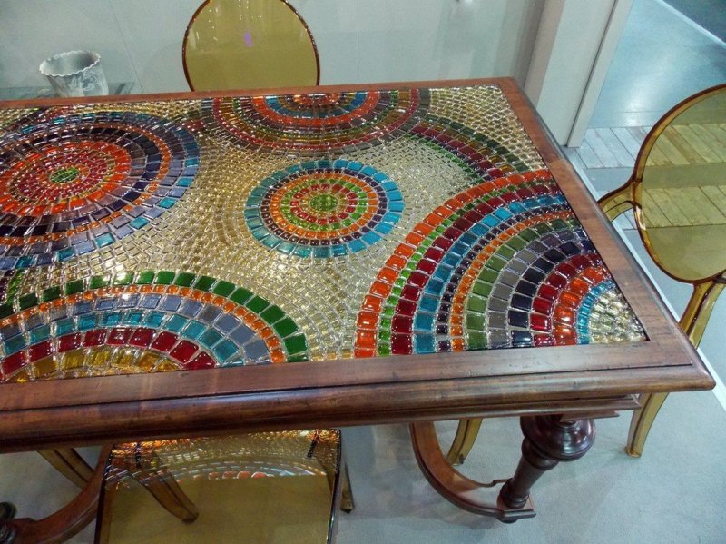 Для больших столов можно использовать не только маленькую мозаику, но и крупную плитку. Работа проводится по аналогичной схеме, но готовый декор будет иметь определенный узор (или будет однотонным).