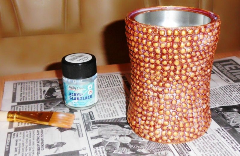 Декорировать можно любой, не представляющий ценности в домашнем хозяйстве предмет. Простая консервная банка приобретет оригинальный вид, если обклеить ее цветными карандашами, украсить прищепками.