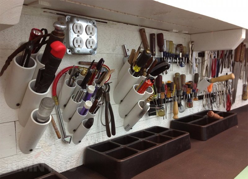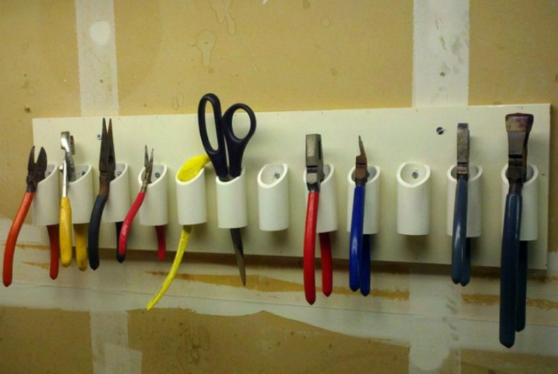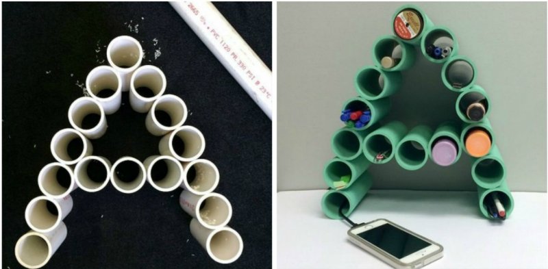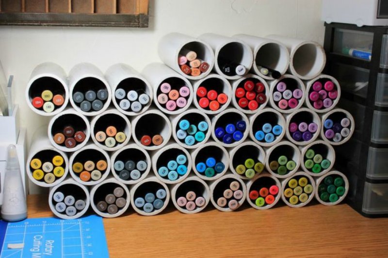 Первые используются, если на столе достаточно места для их размещения. Вторые подойдут для распределения большого количества мелких предметов. Для изготовления органайзера потребуются только сами трубки, крепления для их соединения в единую конструкцию и любой плотный материал, из которого изготавливают дно каждой секции. Можно использовать пластиковые обрезки. Трубки обрезают на фрагменты нужной длины. Затем их соединяют между собой по бокам и приклеивают к конструкции дно. Если органайзер будет крепиться к стене, то верхние края труб обычно обрезают под углом для удобства использования. Вместо дна в этом случае применяют доску или кусок фанеры.