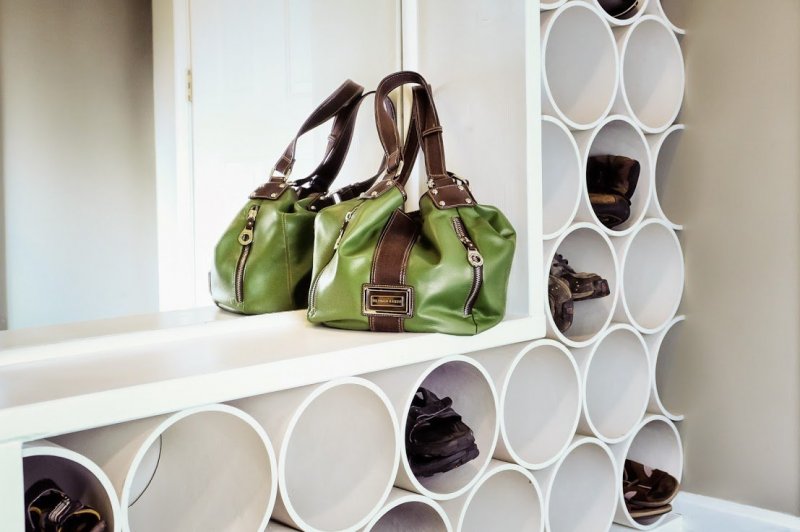 Обувные полки из полипропиленовых труб, как правило, изготавливаются в виде пчелиных сот. Материал разрезают на фрагменты одинаковой длины. Затем их соединяют друг с другом с помощью клея. Полка формируется из рядов обрезков, где каждый последующий фрагмент «ложится» на промежуток между двумя предыдущими, расположенными ниже. Форму такой полке можно придать самую разнообразную. Одно из ее главных достоинств — универсальность конфигурации. Добавляя или убирая трубки-секции, можно подобрать идеальную форму для прихожей, в которой уже расположена мебель, и куда сложно поставить полноценную полку. Некоторые мастера соединяют систему хранения обуви с тумбами или вешалками, чтобы конструкция органично вливалась в общую композицию. Для таких полок подойдут только трубы большого диаметра.