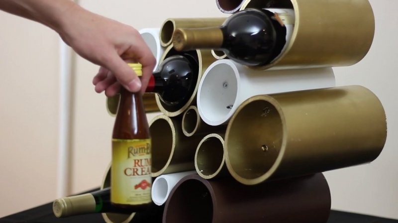 Подставку для винных бутылок из полипропиленовых труб можно изготовить, как и обувную полку в виде «сот», но с применением фрагментов меньшего диаметра. Их тоже подбирают индивидуально, примеряя бутылки. Для конструкции «дерево», подойдут трубки небольшого диаметра. Из них собирают сложную композицию с центральным «стволом» и боковыми веточками-ответвлениями. На конце каждой закрепляют фитинг муфту, с диаметром, подходящим под горлышко бутылки. Затем стеклянную тару вставляют в эти держатели. Винное «дерево» можно декорировать под стимпанк, ретро, эко стиль. Для минимализма можно использовать один отрезок трубы, в котором сбоку вырезают отверстия под горлышки. Фрагмент с помощью саморезов закрепляют на стене (можно под наклоном) и тоже вставляют в него бутылки горлышками вниз.
