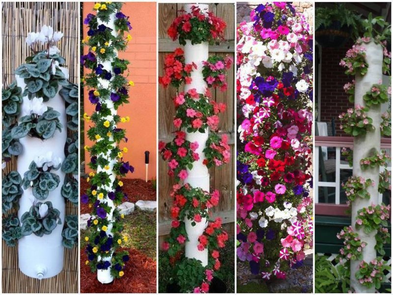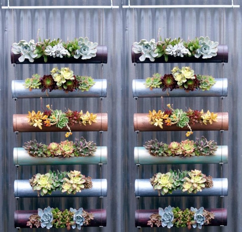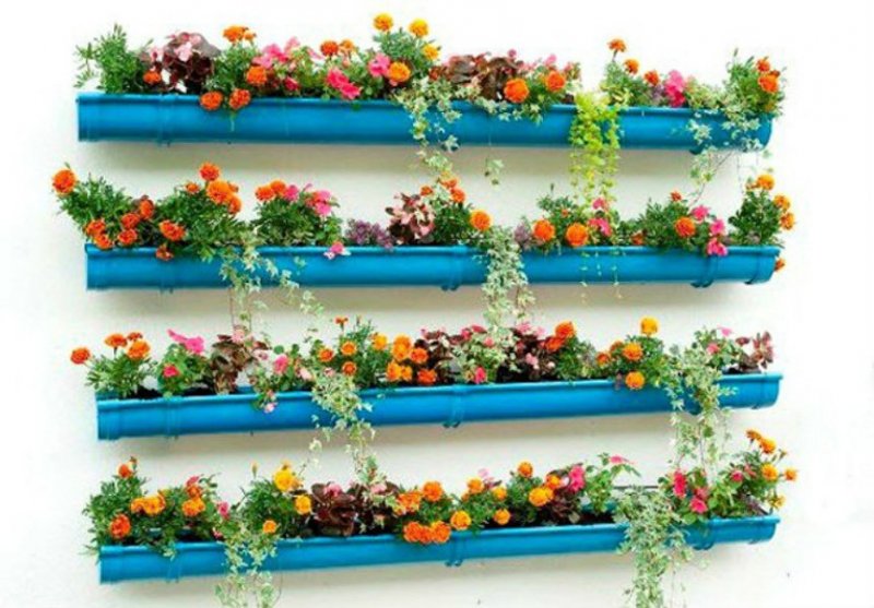 Из полипропиленовых труб большого диаметра можно изготовить горшки для крупных комнатных растений. Для дна лучше использовать более плотный вид пластика. Для небольших зеленых насаждений подойдут трубки малого диаметра, которые группируют в единую композицию. Сверху их обрезают под углом, затем окрашивают в зеленый. Получается конструкция, отдаленно напоминающая заросли бамбука. Горшочек для декоративной травы, злаковых или рассады, изготавливают из труб и заглушек. Фрагменты располагают горизонтально. В каждом вырезают по куску в середине или по всей длине, оставив только небольшие «стенки» по бокам. Затем к обрезку трубы присоединяют по заглушке, насыпают грунт и высаживают растения. Такие горшочки, как правило, закрепляют на стенах. Так они экономят место и не мешаются.
