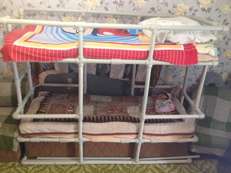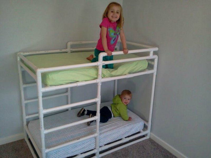Двухъярусная кровать собирается полностью из трубок и фитингов. Непосредственно само спальное место, где будет лежать матрас, укрепляется с помощью коротких трубок, которые часто размещают от боковушки к боковушке. Из материала легко сделать аккуратную лесенку. Если кровать для мальчиков, то к ней можно приладить даже небольшой турничок для физических упражнений по утрам. Для одного ребенка снизу обустраивают рабочее место. Для этого достаточно собрать из трубок дополнительные опоры под столешницу. Если малыш еще совсем кроха, то кровать украшают высокими бортиками.