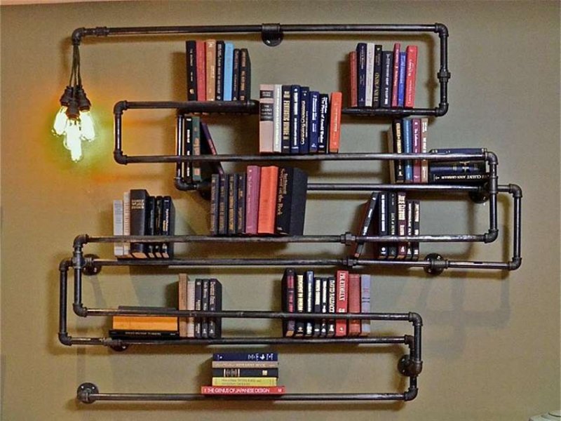 Рассмотрим процесс изготовления систем хранения на примере книжной полки. Для такой мебели можно обойтись только трубами или же дополнительно использовать доски или обрезанные куски МДФ, ДСП. В данном случае значение имеет наполнение, которое будет размещаться на полке. Книги, к примеру, можно вольготно разложить на «пустой» полке без перекладины, если ее ширина меньше ширины издания. И наполнение не будет падать. По такому же принципу можно изготовить полки и подставки-держатели для обуви, журналов, посуды, крышек, бутылок, чашек, разделочных досок, журналов, дисков. Не подойдет этот вариант для тех полок, на которых будет размещаться наполнение разных форм и размеров. Здесь уже придется использовать перекладины из другого материала, которые закрепят на «боковушках» из трубок. Стильно и необычно будут смотреться угловые полки для книг. Для их изготовления потребуются трубы, заглушки, отводы и уголки. Держатель собирают из фрагментов, располагая их П-образными зигзагами. Когда полка будет готова и закреплена, книги будут держаться на ней за счет опоры на саму трубу и стену. Полка идеально подойдет для интерьеров, оформленных в стиле лофт.
