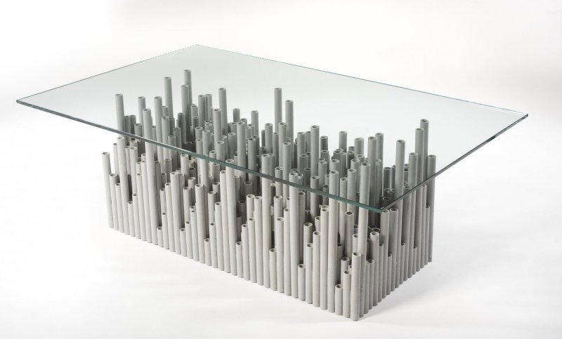 Для изготовления кофейного столика потребуются трубки небольшого диаметра, фитинги и столешница. Стильно будет смотреться крышка из стекла. Система трубок сыграет роль опоры. Их можно соединить между собой по стандартной схеме, как четыре ножки, а можно подключить фантазию и украсить опорную часть столика хитросплетениями трубок, задекорированными различными фитингами.