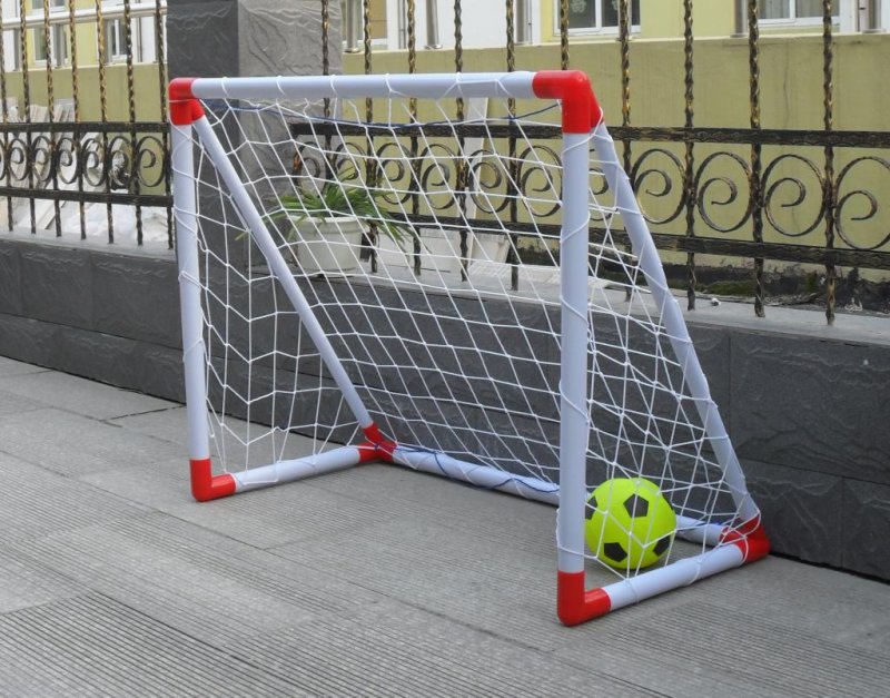Для изготовления футбольных ворот потребуются трубки, сетка, фитинги (уголки, заглушки, тройники). Начинают работу с основания. Оно будет иметь П-образную форму. Сначала из трех коротких фрагментов собирают самую широкую перекладину. Их закрепляют Т-образными деталями. Затем три фрагмента трубки (две коротких боковушки и широкую середину) соединяют между собой с помощью уголков. На кончики «П» надевают такие же фитинги, но с ответвлениями, направленными вверх. Теперь изготавливают абсолютно такую же конструкцию. Ее соединяют со своим «близнецом» через ответвления уголков, которые были направлены вверх, и с помощью двух перекладин, вставленных в Т-образные фитинги. Завершают работу натягиванием сетки.