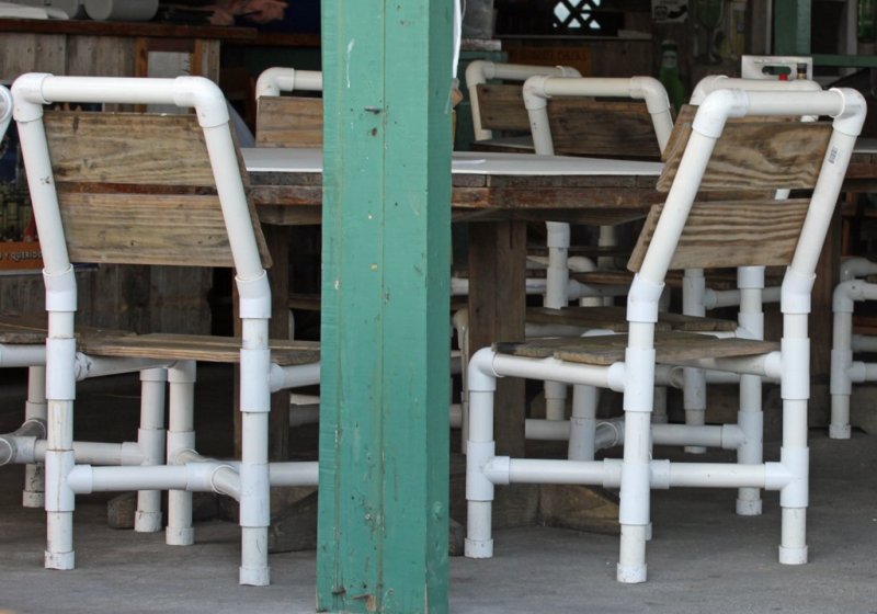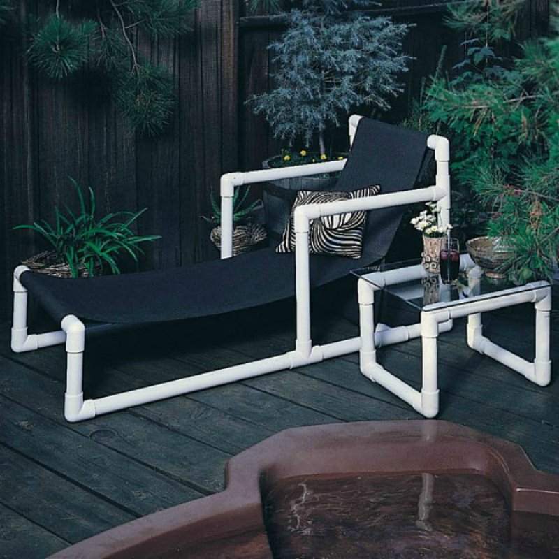 Из полипропиленовых трубок изготавливают стулья, шезлонги, столики, лавочки, лежаки. Лучше выбирать материал белого цвета, который легко комбинируется с деревом, металлом и текстилем любых оттенков. Кроме того, нейтральный тон сделает мебель воздушной и придаст нотки свежести. Лежаки, шезлонги, стулья, можно изготовить по двум принципам: