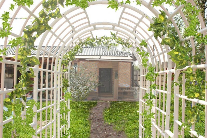 Полипропиленовые трубки обладают достаточной пластичностью для того, чтобы из них можно было сформировать полукруглую арку. Самый простой образчик изделия состоит из двух рядов опор, которые плавно перетекают в верхнюю перекладину, соединенных между собой горизонтальными обрезками при помощи Т-образных фитингов. Чтобы арка покрывала большую часть садовой дорожки, к ней присоединяют дополнительные ряды опор, словно вытягивая конструкцию вдоль. Арка станет великолепной поддержкой для плетущихся роз, винограда, клематиса, плюща и хмеля. Достаточно двух лет, чтобы веточки густо покрыли конструкцию из трубок, оставив только небольшие просветы для солнечных лучиков. Для более сложных вариантов конструкции используют трубки различной длины. Их пересечениями и соединениями украшают стены арки.