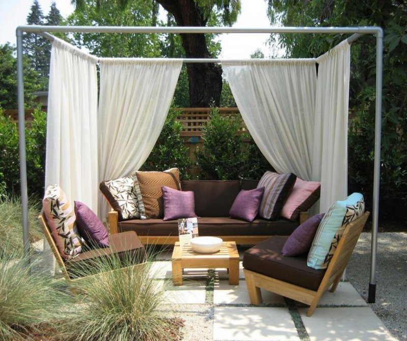 Для беседки из полипропиленовых труб изготавливают каркасную основу. Конструкции можно придать простую квадратную или классическую круглую форму. Крышу покрывают поликарбонатом, непромокаемым полотном или тонкими деревянными рейками. Для патио крыша не нужна, а вот по бокам «стены» беседки создают из развевающихся штор, которые при необходимости дают нужное уединение. Если у мастера имеется внушительный запас полипропиленовых трубок и фитингов (заглушки, крестовины, тройники), то боковые перегородки можно сделать из них в виде частой решетки (классической или под углом 90 градусов).