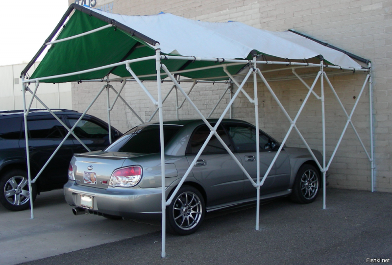 Навес для автомобиля собирают по такому же принципу, как и беседку. В более простых вариантах крышу натягивают из непромокаемого материала (как для палаток) и этим ограничиваются. Если есть время и средства, то парковочное место можно обшить листами поликарбоната сверху и по бокам. Таким образом машина будет защищена от дождя и ветра, что позволит даже работать над ремонтом авто в непогоду.