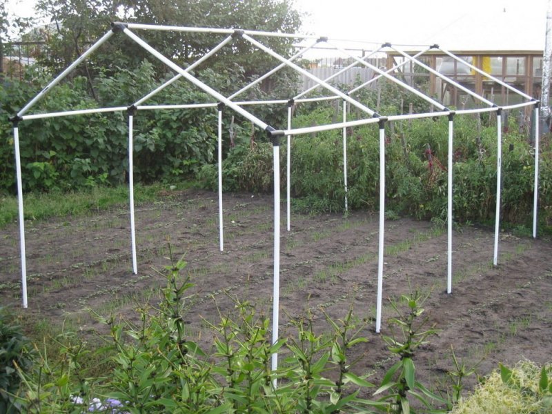 Теплица из полипропиленовых трубок — сооружение более «серьезное» и громоздкое, чем примитивный парник. В нее, как правило, привозят специальный грунт, обустраивают высокие грядки, стены снабжают окнами, открывающимися при необходимости проветривания, предусмотрено наличие полноценной двери, закрывающейся на шпингалет. Так как сооружение более монументальное, его обычно покрывают не тонкой пленкой, а листами поликарбоната, которые закрепляют на «скелете» из полипропиленовых трубок. Форма теплицы может быть как классической полукруглой, так и квадратной, прямоугольной. Собирают конструкцию по принципу сборки беседок. Внутри ее обычно снабжают специальными полками из тех же трубок, которые в дальнейшем сыграют роль подставок под длинные горшки с рассадой и дополнительно укрепят конструкцию.