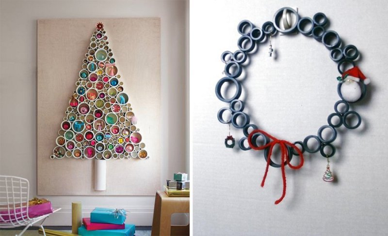 Из полипропиленовых труб можно сделать необычную настенную елку, если под рукой нет искусственной сборной красавицы, а куранты вот-вот пробьют полночь. Собирают деревце из «колечек», на которые нарезают трубки. Их соединяют между собой, придавая форму елочки. Лучше использовать трубки разных диаметров. Каждой колечко окрашивают в определенный оттенок. Чтобы добавить поделке налет праздника, ее дополнительно покрывают глиттером. В каждое «колечко» вкладывают по новогодней игрушке. В некоторые можно вложить миниатюрные подарки. Кстати, таким образом легко «спрятать» презенты от детей, и превратить их поиск в увлекательную игру. Новогодний венок на входную дверь тоже собирают из «колечек». Чтобы украшение бросалось в глаза прохожих и гостей, его оформляют по принципу контрастов. К примеру, используют колечки только белого цвета, в которые выборочно вкладывают яркие новогодние шарики и игрушки в рамках одного-двух оттенков.