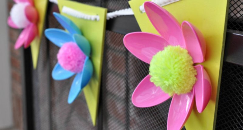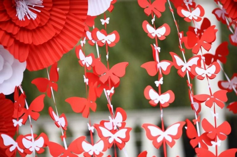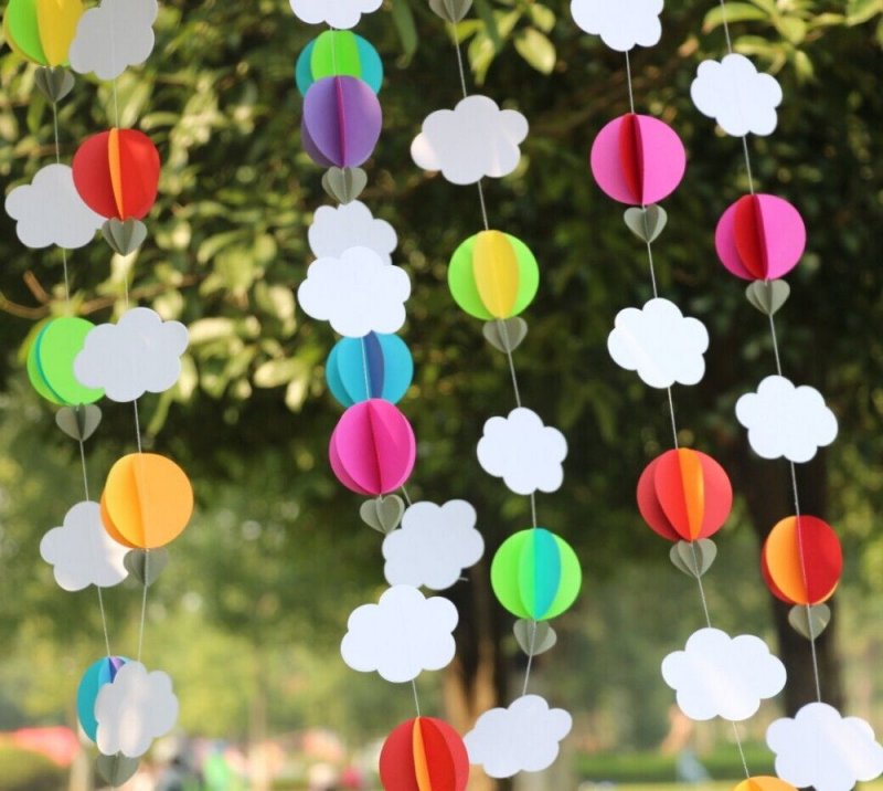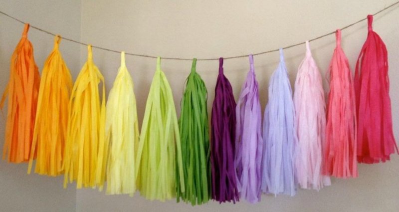 Некоторые варианты гирлянд подойдут практически для любого торжества. Самодельная электрогирлянда сама по себе способна создать праздничную атмосферу даже в самом скромном интерьере. Цветочные мотивы также являются наиболее популярным вариантом декора, а разноцветные помпоны, кисточки из остатков пряжи, придадут оформлению «мягкость», уют. Журавлики, самолетики, бабочки, выполненные в технике оригами из страниц старых книг, журналов, буклетов – простой способ украшения, не требующий материальных затрат. Шарики различного размера – вообще универсальнейший вариант.