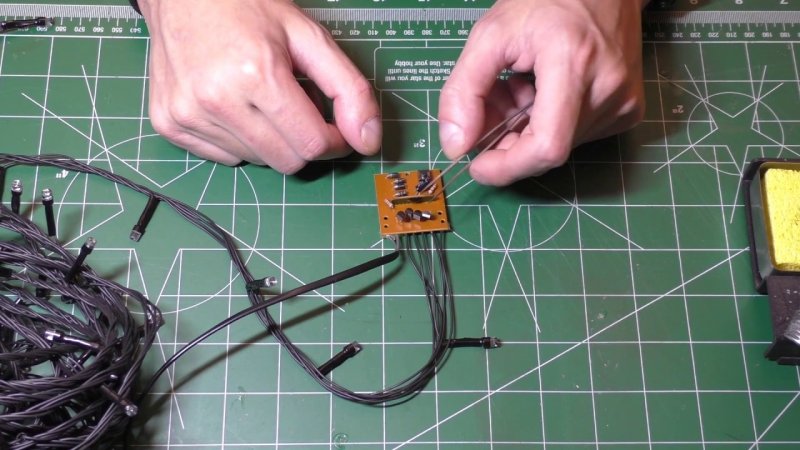 Другой способ изготовить растяжку – применить светодиоды по 12 вольт. Для этого нужны лампочки, паяльник, герметик, ножик, провод, блок питания на 12 вольт. Расстояние между светодиодами делается около 20 см. На проводе производятся соответствующие отметки – эти места зачищаются на 12-17 мм, чтобы закрепить лампочки. Потом на оголенные жилы наносится канифоль и немного припоя, монтируются лампочки – чтобы они лучше держались, после припаивания их основание оборачивается изолентой, заливается герметиком. В последнюю очередь закрепляют резистор с блоком питания.