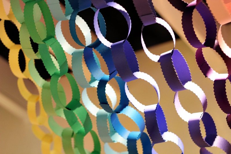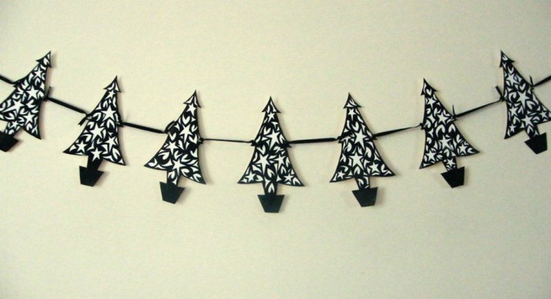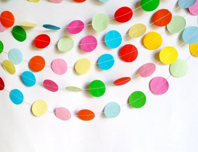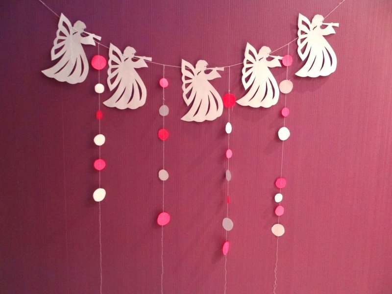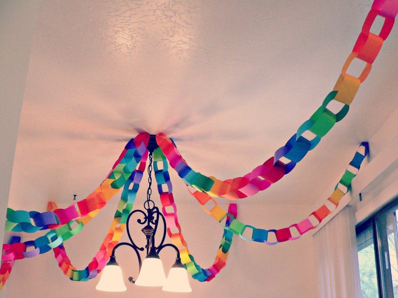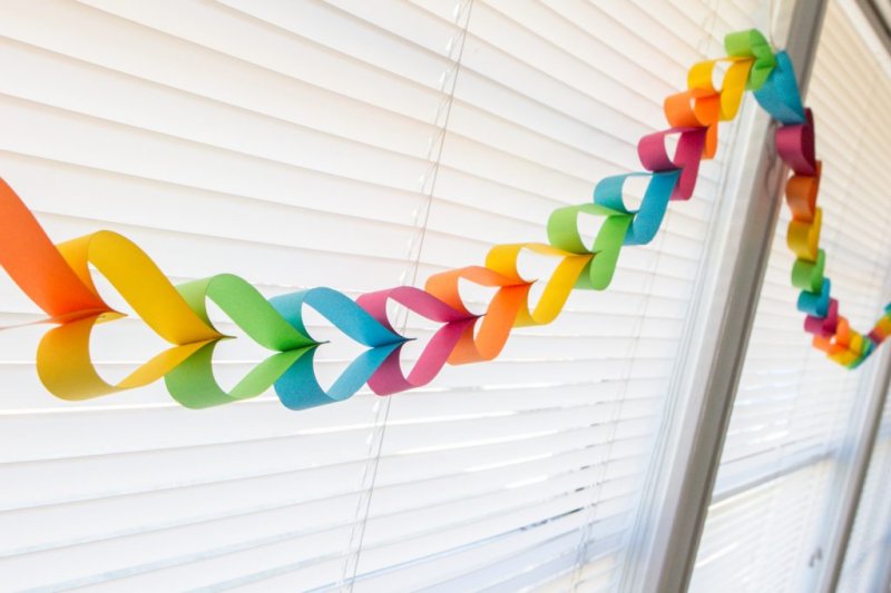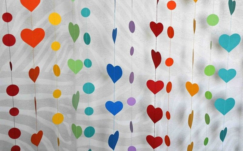 Бумажные гирлянды – наиболее легкий, дешевый способ украсить жилище к предстоящему празднику, выделив отдельные места в комнате, поделив ее на сегменты. Для самой простой растяжки вырезаются однородные элементы разного цвета – кружочки, сердечки, буквы, фигурки животных, листики, бабочки, ажурные вытынанки и др. Детали поочередно пристрачиваются на машинке в одну линию или нанизываются на длинную нитку. В последнем случае каждый фрагмент протыкают иголкой в двух местах.